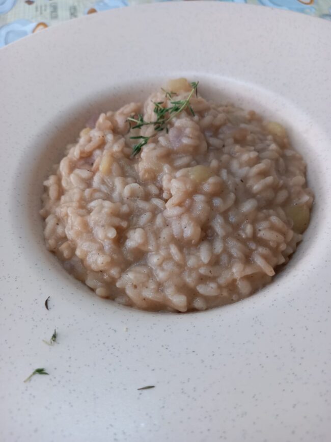 🧾 Ingredientes (2 porções) 2 batatas médias (cubos pequenos) 1 xícara de arroz arbóreo 1/2 cebola picada ~1 litro de caldo de descartes quente 2 colheres de sopa de azeite 1 colher de sopa de manteiga vegetal 2 colheres de sopa de aceto balsâmico 2 colheres de sopa de levedura nutricional Sal e pimenta 🔥…