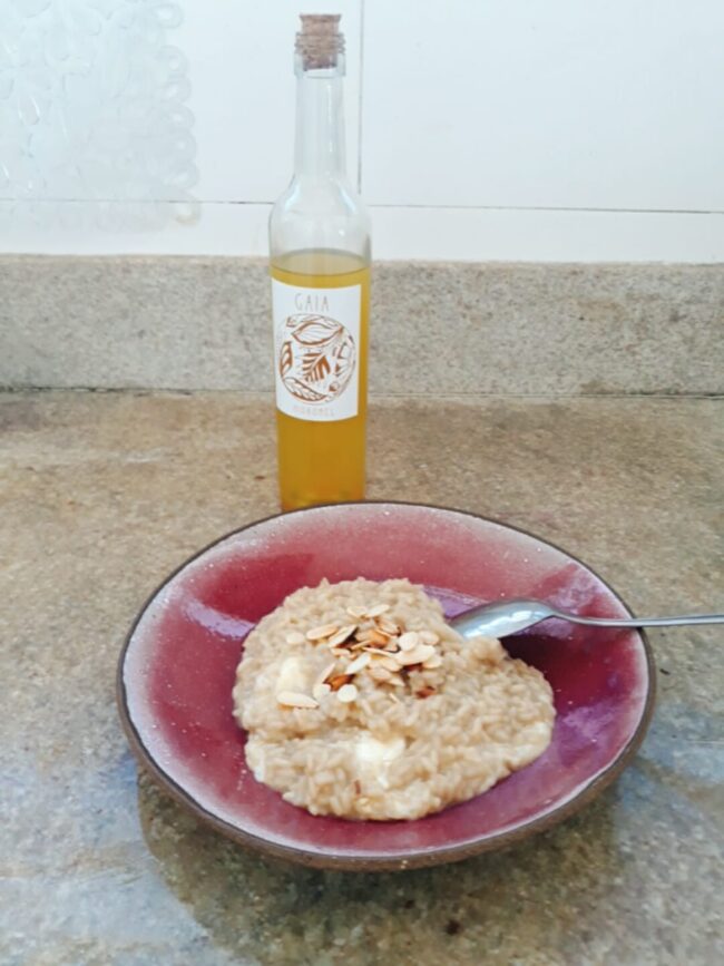 Ingredientes: 1 colher (sopa) manteiga 1 colher (sopa) azeite 1 cebola ralada 1 1/2 xícara de arroz para risoto 1/4 xícara de Hidromel Gaia 1 colher (chá) de sal 200 gr queijo Brie ou Camembert 50 gr Amêndoas em lascas 3 colheres (sopa) manteiga Caldo de Legumes 1 colher (sopa) azeite Descartes de ingredientes Ou…