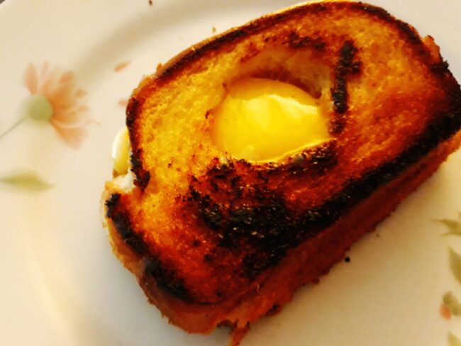 Ingredientes:2 fatias de pão de formaManteiga para untar2 fatias de baconAçúcar2 fatias de queijo1 gema Modo de Preparo:1.Com uma xícara de café faça um furo numa das fatias de pão.2.Com uma colher unte o lado das duas fatias de pão.3.Numa frigideira, leve a fatia de pão furada e as duas fatias de bacon. Espalhe açucar…
