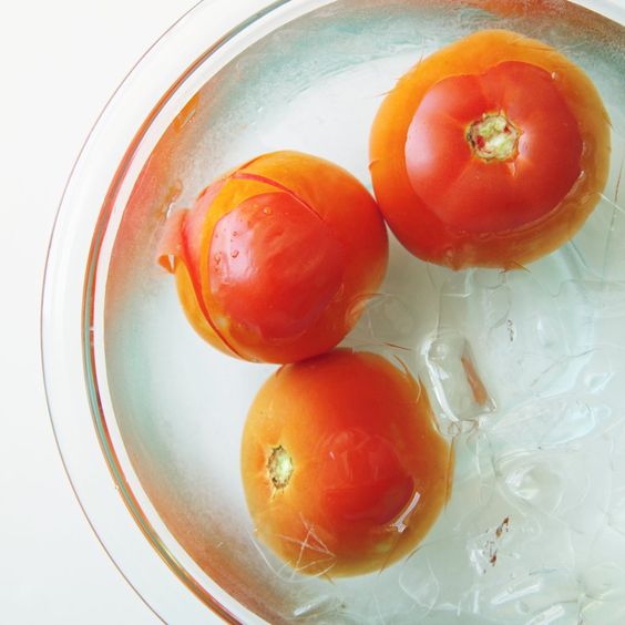 Tirar pele do tomate de forma rápida e prática. Fazer um “X” na bundinha do tomate e colocar numa panela com água fervente até rachar a pele. Você pode jogar no fundo da pia e tirar a pele ou colocar numa bowl com água gelada.