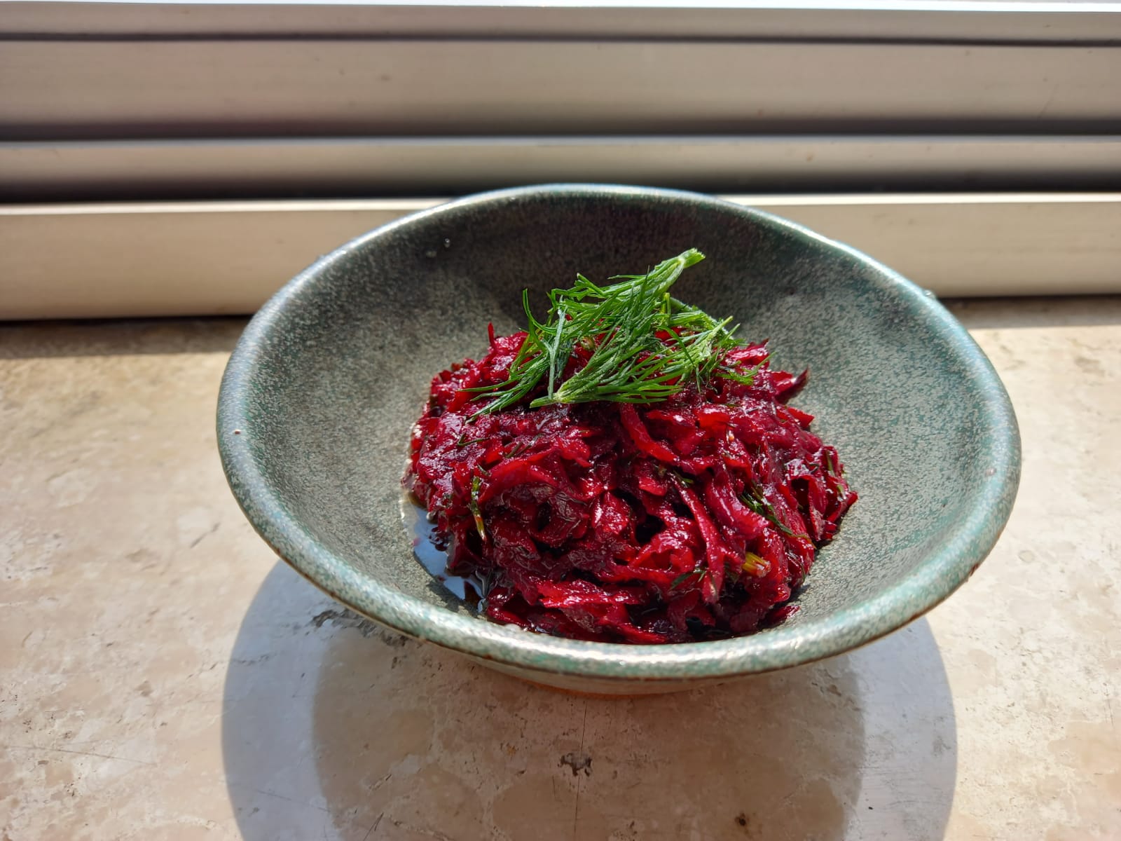 Ingredientes: • 1 beterraba • ½ colher (chá) de sal • Pimenta do reino • ½ colher (sopa) aceto balsâmico • 3 colheres (sopa) azeite • Dill ou Salsinha picada Modo de Preparo: 1. Rale a beterraba. 2. Numa vasilha misture: sal, pimenta, aceto, azeite e dill. Teste o sal. 3. Coloque na geladeira e…