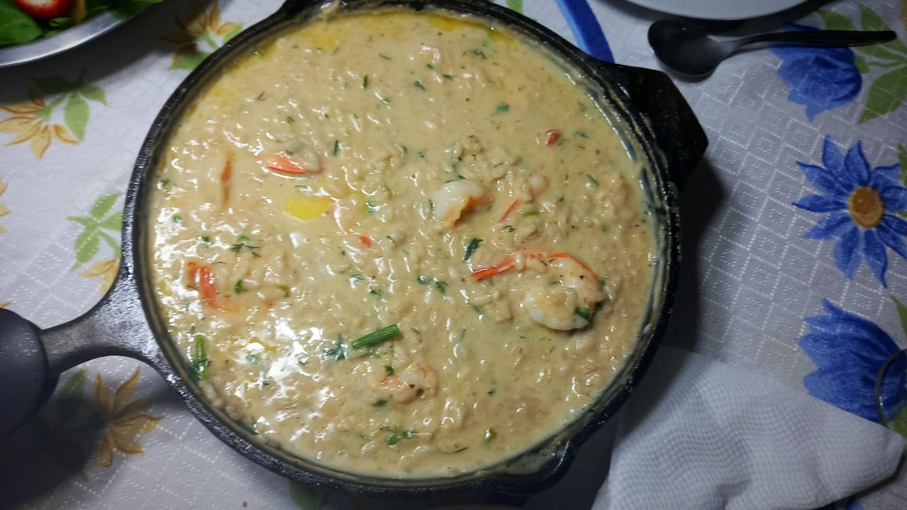 Ingredientes: 1 colher (sopa) de azeite 1 colher (sopa) de manteiga ½ cebola ralada 1 ½ xícara de arroz arbóreo 1 dose de vinho branco (usei Arak que dá um ar mais doce por causa do anis) 1 ½ colher (chá) de sal 200 gr camarão grande 1 pote de requeijão Endro 4 colheres (sopa)…
