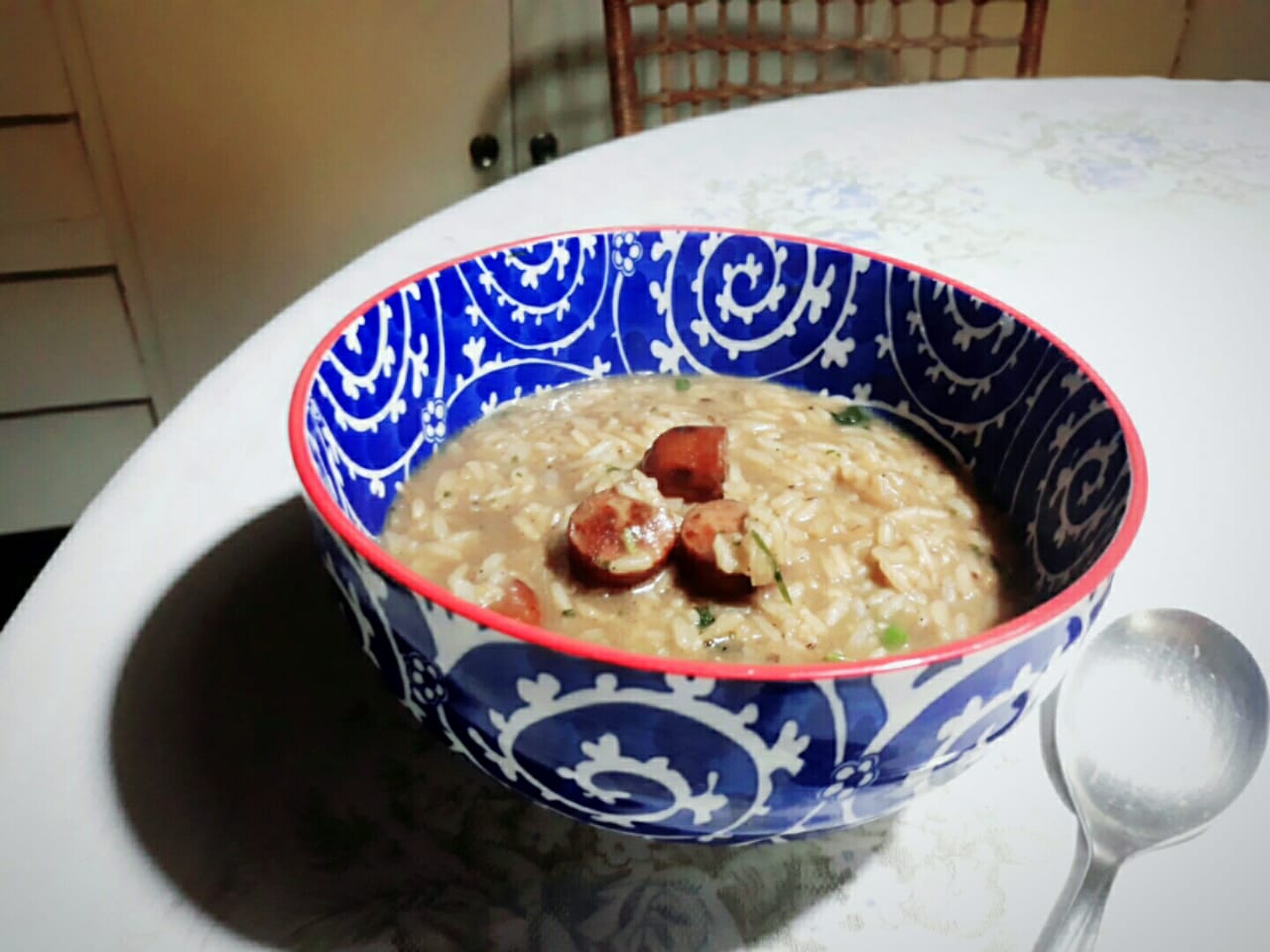 Essa receita é baseada no Arroz de Talos da Paola Carosella, que o truque básico é tratar o arroz agulhinha como arroz de risoto. Ela usa água quente, mais como foi falado, eu estou usando muito Caldo de Descartes. Como esses descartes têm um pouco de tudo, é muito mais saboroso, pois tem gosto de…