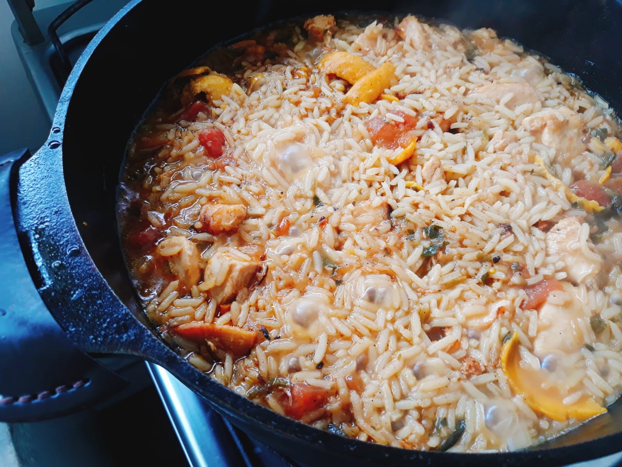 Ingredientes: • Manteiga de garrafa • 1 quilo de peito de frango em cubos • 2 xícaras (chá) de arroz • 1 cebola ralada • 2 alhos picados • 2 tomates sem pele e sem semente em cubos • ¼ xícara de pequi em conserva • 2 pimentas biquinho picadas • Coentro • 1 colher…