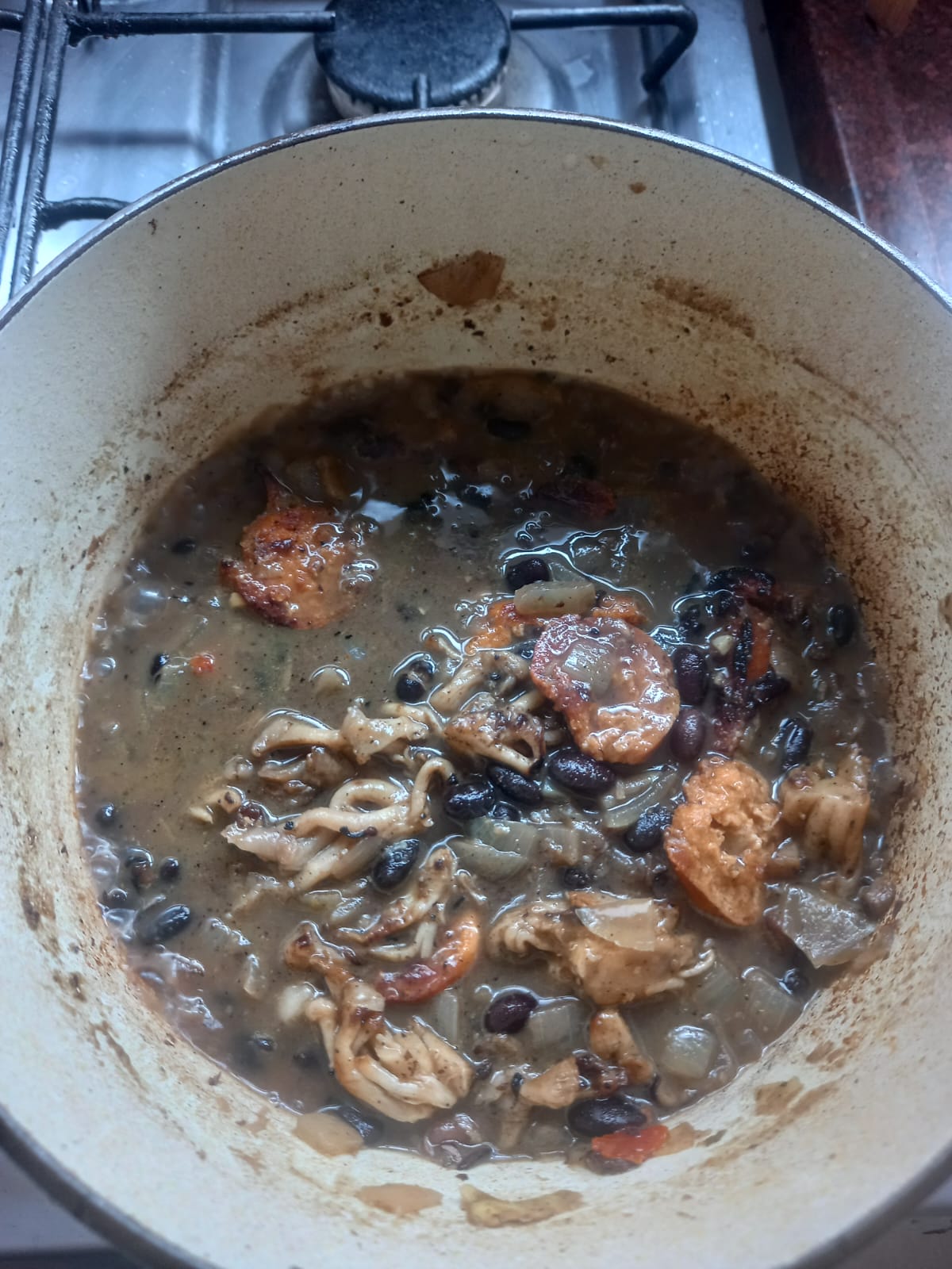 - Volte o cogumelo e a linguiça na panela.
