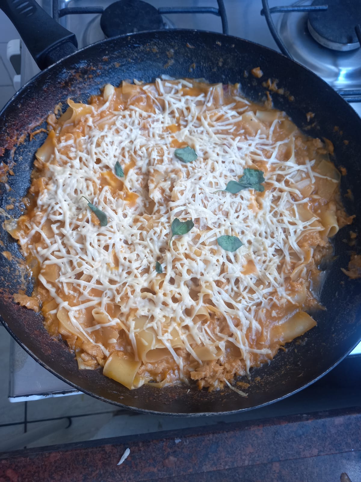 - ➕ Adicione a pasta de tomate, o atum vegano, o creme de leite e o caldo.